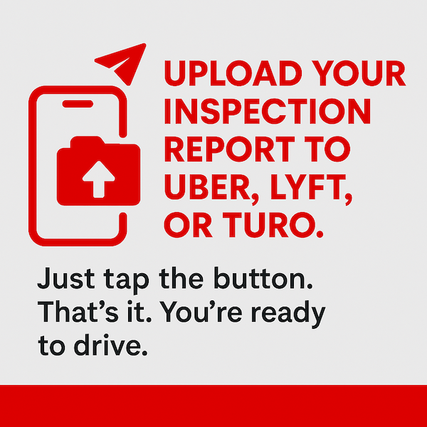 You’ll get your official inspection checklist delivered straight to your email and uploaded to your online dashboard, ready to submit instantly to Uber, Lyft, Turo, or any other platform you need. Fast, easy, and fully approved.